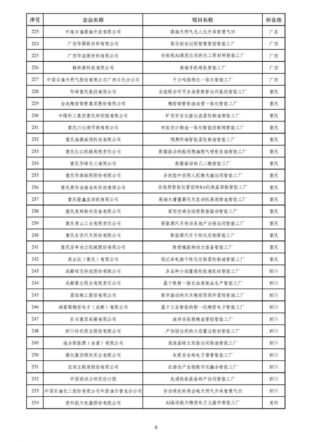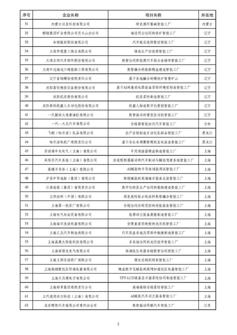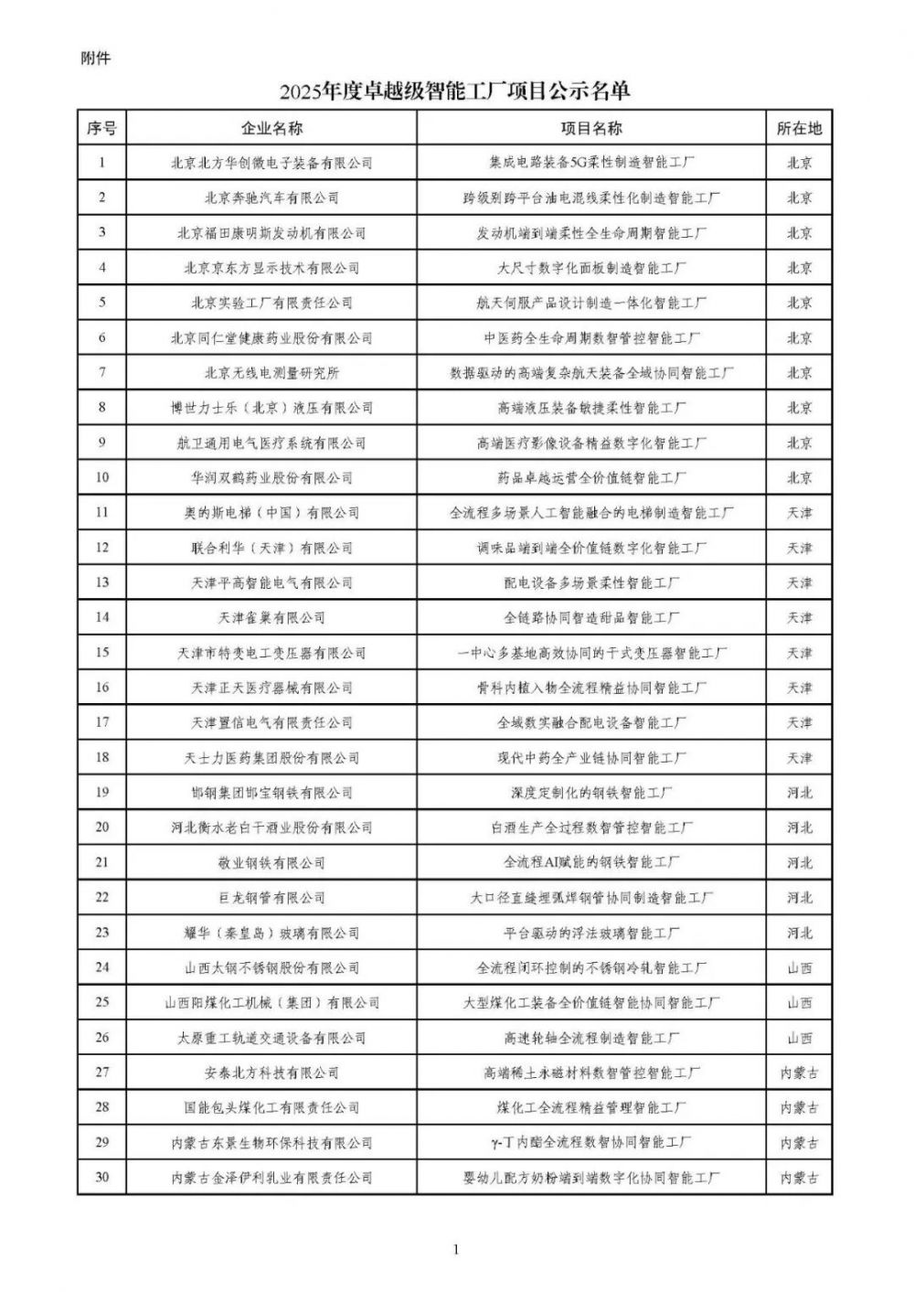根据《关于开展2025年度智能工厂梯度培育行动的通知》(工信厅联通装函〔2025〕251号),现将拟入选的2025年度卓越级智能工厂项目名单进行公示,请社会各界监督。如有异议,请在公示期内将书面意见反馈至工业和信息化部装备工业一司(智能制造处)。 公示时间:2025年9月5日至2025年9月11日 电 话:010-68205630 传 真:010-66013726 附件:2025年度卓越级智能工厂项目公示名单 工业和信息化部装备工业一司 2025年9月4日