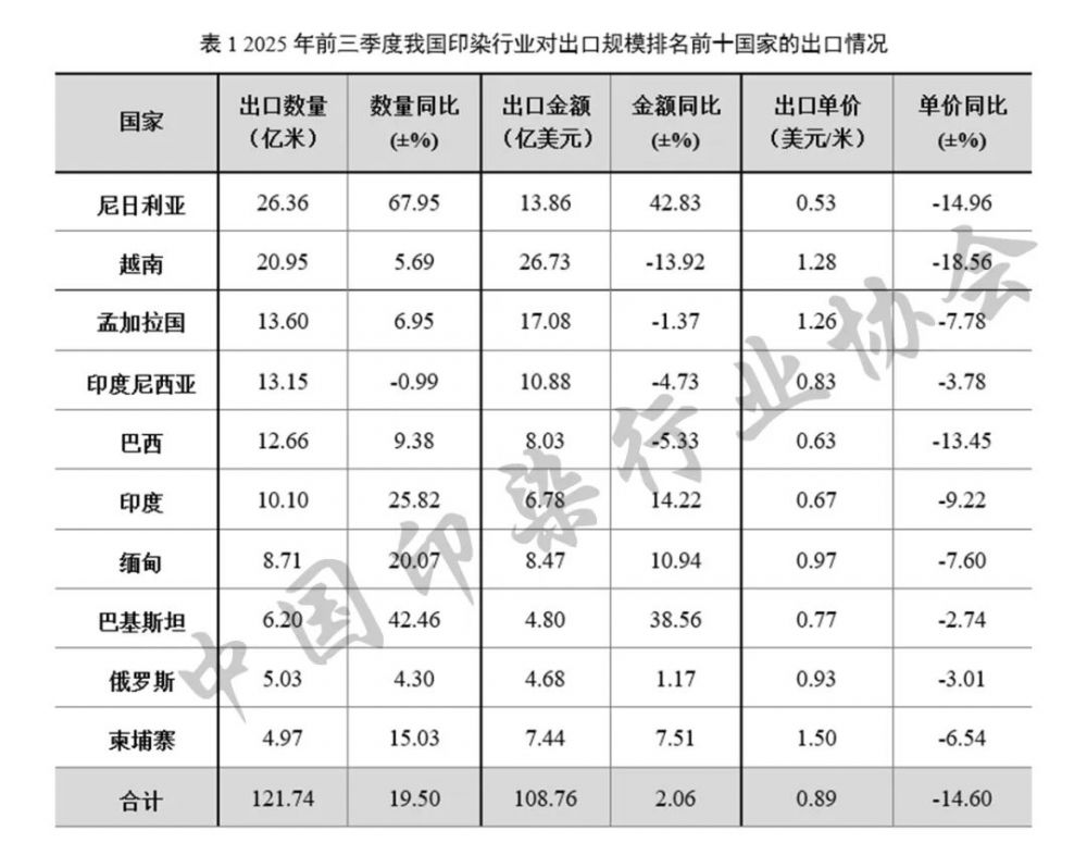 今年以来,世界经济增长动能不足,贸易保护主义盛行,地缘政治冲突、国际贸易摩擦等问题频发,外部环境变化带来的不利影响加深,国内有效需求不足、投资增长偏弱等结构性矛盾依然存在,经济稳定运行面临诸多困难挑战,但我国经济“稳”的格局、“进”的势头、“韧”的特性没有改变,前三季度经济运行保持总体平稳、稳中有进发展态势,为印染行业稳定发展提供坚实支撑。1~9月,我国印染行业生产保持增长态势,出口展现较强韧性,主要印染产品出口数量创历史同期新高,但美国贸易政策迫使全球贸易进入大调整阶段,我国印染行业面临的外贸风险加大,市场竞争进一步加剧,行业主要经济效益指标明显下滑,企业向新向好发展面临较大压力。 一、生产形势总体平稳,产量实现小幅增长 根据国家统计局数据,2025年1~9月,印染行业规模以上企业印染布产量同比增长1.57%,增速较上半年加快1.01个百分点。三季度,规模以上印染企业印染布月度产量均低于50亿米,但较上年同期均实现小幅增长。今年以来,国家各项提振消费政策持续落地显效,纺织服装终端消费保持温和复苏态势,为印染行业生产提供良好支撑。前三季度,我国限额以上服装、鞋帽、针纺织品类商品零售额10613亿元,同比增长3.1%,增速较上年同期提高2.9个百分点;纺织服装网络零售渠道延续逐季改善态势,前三季度全国网上穿类商品零售额同比增长2.8%,增速较今年一季度和上半年分别提高2.9和1.4个百分点。 图1 2025年前三季度我国印染行业规模以上企业印染布产量及增速 二、外贸展现较强韧性,出口压力明显加大 根据中国海关数据,2025年1~9月,我国印染八大类产品出口数量271.66亿米,同比增长12.30%,增速较上半年提高1.41个百分点;出口金额227.63亿美元,同比增长0.18%,增速较上半年提高0.72个百分点;出口平均单价0.84美元/米,同比下降10.79%,降幅较上半年加深0.49个百分点。今年以来,美国关税政策呈现广泛覆盖、显著波动以及高度不可预测等特点,对全球贸易格局产生深远影响,国际经贸规则加快重塑。我国印染行业出口受到明显扰动,但市场竞争优势依然明显,主要印染产品出口数量保持较快增长,其中纯棉印花布、合成长丝织物、涤纶短纤织物出口增速分别达到47.47%、13.22%和13.38%,均高于印染八大类产品整体出口增速。美国关税政策进一步加剧市场竞争,前三季度,我国印染八大类产品出口平均单价呈现明显下降态势,且降幅较上半年进一步加深,企业普遍面临价格竞争压力。 图2 2025年前三季度我国印染八大类产品出口增速情况 前三季度,我国印染八大类产品对东盟出口数量60.64亿米,同比增长5.96%,占出口总量的22.32%;出口金额64.35亿美元,同比下降5.93%;出口平均单价1.06美元/米,同比降低11.22%。受美关税政策影响,我国印染行业对东盟出口呈现放缓态势,出口数量和出口金额增速分别低于总体水平6.34和6.11个百分点,出口平均单价降幅高于总体水平0.43个百分点。对RCEP成员国出口数量64.64亿米,同比增长5.89%,占出口总量的23.79%;出口金额67.87亿美元,同比下降5.73%;出口平均单价1.05美元/米,同比下降10.98%。日本是RCEP成员国中唯一实现量价齐升的国家。 面对复杂的全球贸易环境,我国印染企业积极调整产品结构,持续拓展“一带一路”沿线国家和非洲等国际市场。前三季度,我国印染行业出口规模排名前十的国家出口数量121.74亿米,同比增长19.50%,高于整体增速7.20个百分点,其中,对尼日利亚、巴基斯坦、印度出口数量分别大幅增长67.95%、42.46%和25.82%,对缅甸和柬埔寨出口数量增速均高于对全球出口整体增速。对前十国家的出口平均单价降幅高于整体水平3.81个百分点,其中对越南、尼日利亚和巴西出口平均单价降幅分别达到18.56%、14.96%和13.45%。 三、运行质效显著承压,企业运营压力较大 三季度,印染行业主要运行质量指标仍延续低位运行态势,印染企业运营压力明显加大。根据国家统计局数据,2025年1~9月,规模以上印染企业三费比例7.24%,同比提高0.35个百分点;产成品周转率12.61次/年,同比降低7.61%,降幅较上半年收窄0.38个百分点;应收账款周转率7.05次/年,同比降低12.72%,降幅较上半年扩大7.93个百分点;总资产周转率0.89次/年,同比降低10.41%,降幅较上半年扩大3.40个百分点。 前三季度,规模以上印染企业营业收入同比减少8.71%,降幅较上半年扩大3.42个百分点;利润总额同比大幅减少17.76%,降幅较上半年扩大0.46个百分点;成本费用利润率4.23%,同比降低0.47个百分点;营业收入利润率3.94%,同比降低0.44个百分点。1857家规模以上印染企业亏损户数为698户,亏损面37.59%,同比扩大3.33个百分点;亏损企业亏损总额27.69亿元,同比增长0.53%。今年以来,世界经济增长放缓,国内外纺织服装市场需求总体偏弱,叠加美国关税政策对全球供应链带来的冲击与影响,我国印染行业运行质效显著承压,亏损面较去年同期进一步扩大,企业经营压力较大。 图3 2025年前三季度我国印染行业规模以上企业营业收入和利润总额增速情况 四、四季度印染行业运行趋势预判 展望四季度,印染行业发展面临的外部不稳定不确定因素依然较多。从全球范围看,地缘政治冲突呈现长期化趋势,深刻影响全球稳定和繁荣发展;美国关税政策使得全球贸易体系进入深度调整期,同时也将推高纺织服装消费成本,或进一步抑制国际市场需求;国内方面,内需不足仍是当前经济发展的
